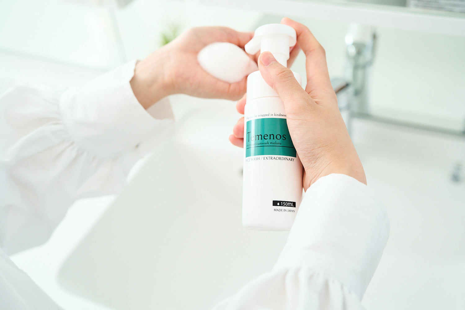 3〜5プッシュ程度をてのひらに取り、なるべく摩擦を起こさないよう、